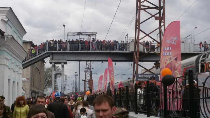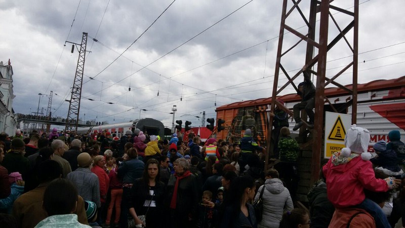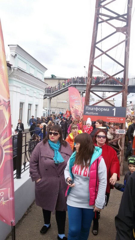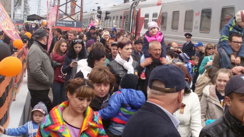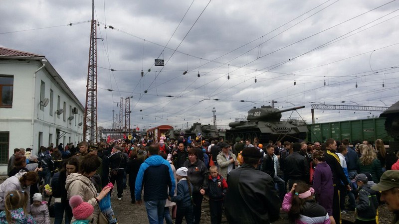 07.05.16Сегодня в 13.40 состав прибыл в Уссурийск. Еще до прибытия поезда на железнодорожной платформе начал скапливаться народ. Даже за час до остановки уникального музея, на станцию трудно было попасть. Количество желающих увидеть бесценные материалы времен Великой Отечественной войны поражало своими масштабами.