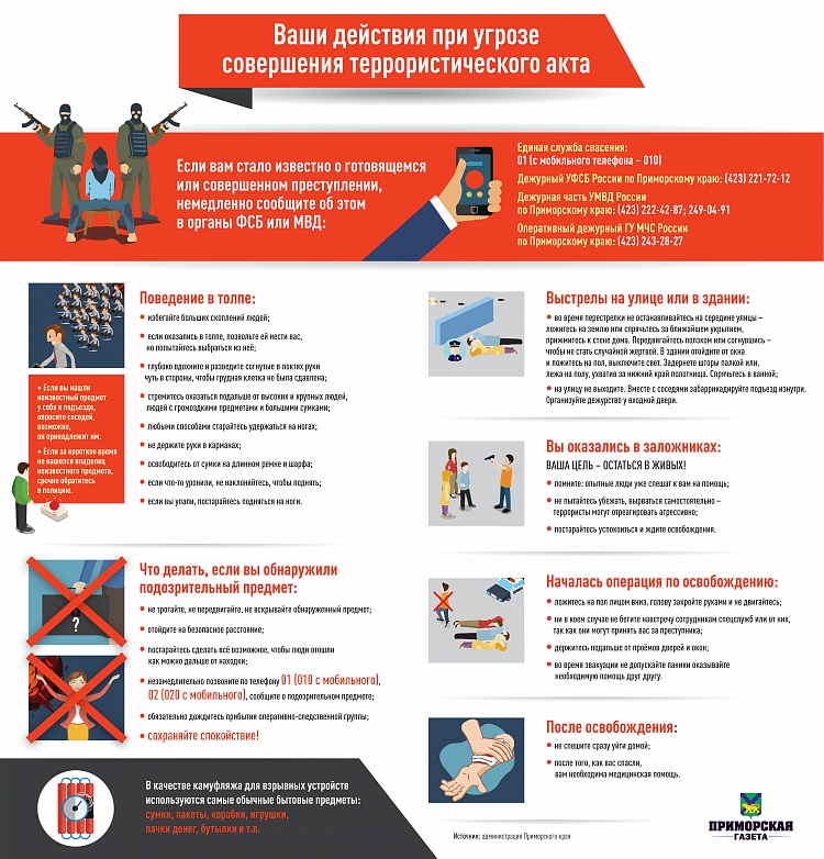 03.11.16Во время ноябрьских праздников в Приморье запланирована насыщенная культурная программа. Правоохранительные органы напоминают о том, как вести себя в местах массового скопления людей и что необходимо сделать при обнаружении подозрительных предметов.
