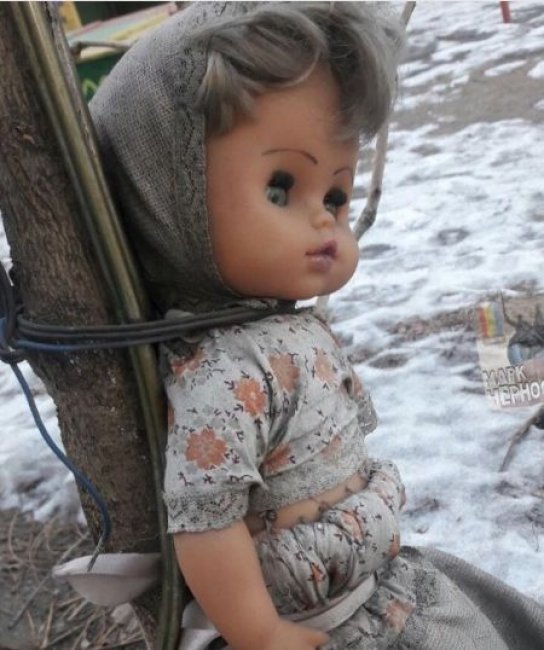 Бабушки посадили на кол плюшевых зайку и мишку, а куклу привязали веревкой к дереву.