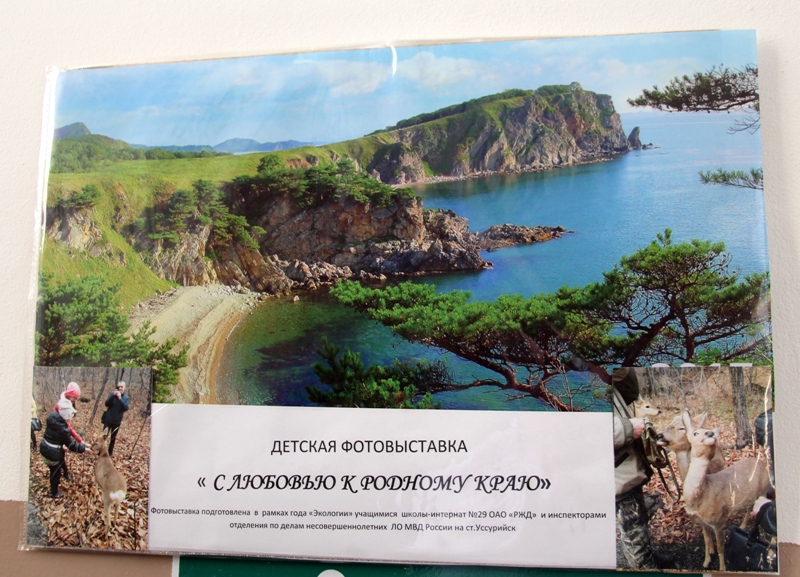 30.03.17В административном здании транспортной полиции, по инициативе учащихся школы-интернат № 29 ОАО «РЖД» и при содействии инспекторов по делам несовершеннолетних Линейного отдела на стенах межэтажного лестничного прохода развернута детская фотовыставка «С любовью к родному краю», где 30 юных фотографов представили на суд полицейских свой взгляд о красоте приморской природы, которой они любовались в разные дни школьных каникул, сообщает «Золото Уссурийска» со ссылкой на пресс-службу ЛО МВД России на ст.Уссурийск