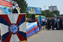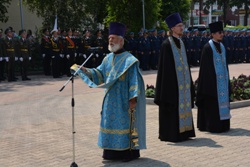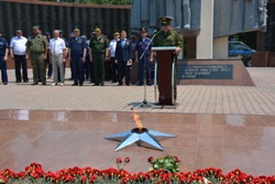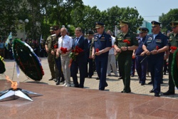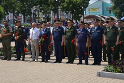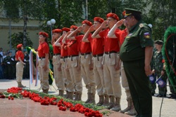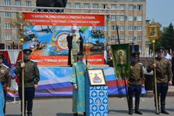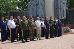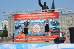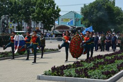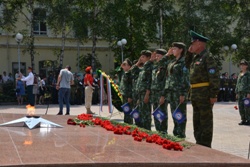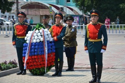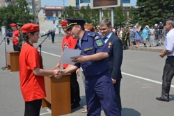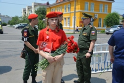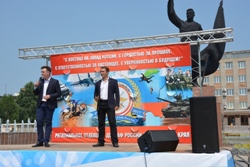 Началось торжественное мероприятие со встречи колонны участников международного комбинированного пробега «С востока на запад России – с гордостью за прошлое, с ответственностью за настоящее, с уверенностью в будущее», проводимого в честь юбилея ДОСААФ. На площадь Победы юноармейцами торжественно был вынесен Вымпел 90-летия ДОСААФ.