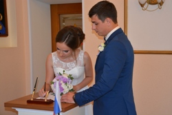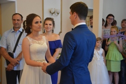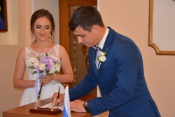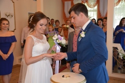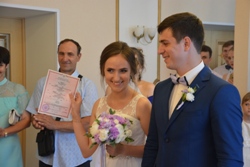После традиционной процедуры скрепления семейного союза подписями, обмена кольцами, торжественной клятвы молодоженов и первого супружеского поцелуя, молодой семье было вручено свидетельство о заключении брака. Этот самый дорогой и памятный семейный документ был передан сотрудниками управления ЗАГС в надежные руки хранительницы семейного очага.