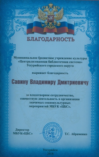 Об этой теме творчества В. Савина подробно рассказывает и профессиональный видеофильм, который увидели собравшиеся на этой встрече. Кадры проникнуты огромным уважением коренного уссурийца к своей малой Родине. Красочно оформленный диск с этой телевизионной работой Владимир Дмитриевич преподнёс в дар центральной городской библиотеке. Выходит, что познакомиться с местным художником и его работами теперь сможет и каждый посетитель ЦГБ.