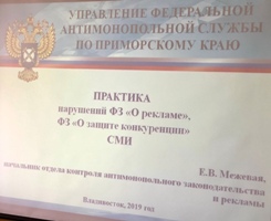 Далее выступила Елизавета Межевая, начальник отдела контроля антимонопольного законодательства и рекламы Приморского УФАС России, которая подытожила в своей презентации часто встречающиеся в практике нарушения Закона № 38-ФЗ «О рекламе». Особенно такие нарушения относятся к сфере предоставления медицинских, финансовых услуг и дистанционного способа продаж.