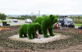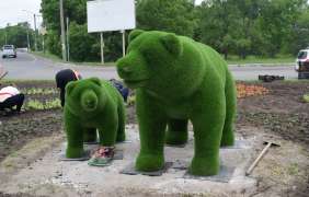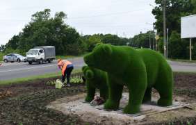 Как отметили в управлении благоустройства, ранее на это участке располагалась рекламная конструкция, которая впоследствии была демонтирована. Сейчас транспортную развязку украшают объемные фигуры медведей – большого и маленького. Формы изготовлены из стеклопластика и искусственного газона, то есть зимой и летом они будут зеленого цвета. Высота большой медведицы – 1,5 метра, длина – 2,5 метра.
