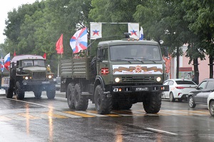 Затем по дорогам города проследовала колонна из 10 автомобилей с декорациями эпизодов разгрома Квантунской армии на Дальнем Востоке.