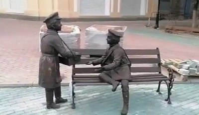 Уже установлены старые часы. Стоят фигуры городового с собакой, дамы с зонтиком. А в ладошку юного коробейника уже кто-то из жителей положил монетку.