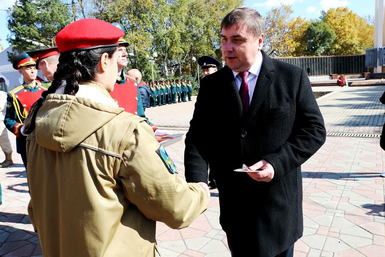 15.10.21В Уссурийске на площади Победы у Вечного огня состоялось торжественное мероприятие, посвященное приему школьников округа в ряды Всероссийского детско-юношеского военно-патриотического общественного движения «Юнармия».