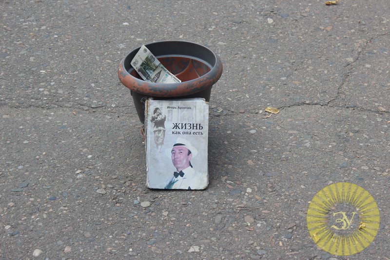 В течение восемнадцати лет Игорь Арончик в образе Рембрандта проеахл буквально по всему миру. На этот раз, преодолев с женой путь в 12 тысяч километров на своем автомобиле, он прибыл в Уссурийск. Семья находится в пути уже около четырех месяцев. Все расходы на проживание и дорогу Игорь Арончик берет из своих личных средств и тех денег, которые люди в благодарность за выступление бросают в горшок.
