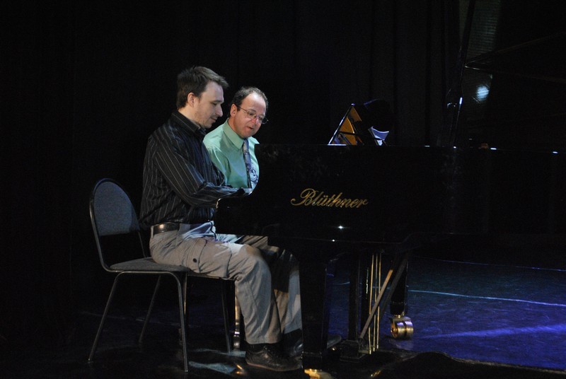 В дружественной и творческой обстановке проходило общение с гостем. Особенно живо воспринималось зрителями то, что наши студенты смело выходили и демонстрировали свое умение владеть инструментом, а преподаватель по классу фортепиано - Евгений Георгиевич Каневский мастерски импровизировал на рояле вместе с американским пианистом.