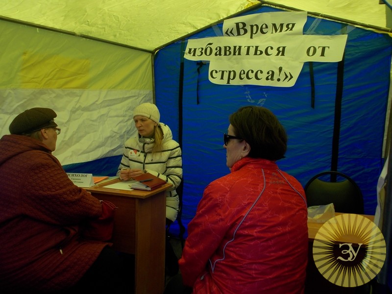 Так же, на площади развернулись тематические палатки: «Время питаться правильно» (консультации проводила врач - терапевт, Т. Г. Макарова), «Время беречь сердце» (все желающие могли узнать уровень своего артериального давления), «Время избавиться от стресса» (с людьми беседовала психолог, А. О. Грецких), и «Время заняться спортом» (информацией делилась спортивный врач, Е. В. Невзорова). К слову, больше всего горожане заинтересовались проверкой своего давления и мобильной психологической помощью. А ещё, все желающие могли бесплатно попробовать артезианскую воду «Ключ здоровья».