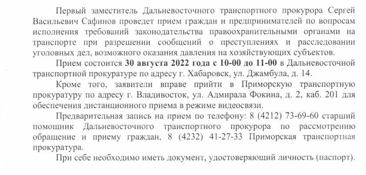 Первый заместитель Дальневосточного транспортного прокурора Сергей Васильевич Сафинов проведет прием граждан и предпринимателей по вопросам исполнения требований законодательства правоохранительными органами на транспорте при разрешении сообщений о преступлениях и расследовании уголовных дел, возможного оказания давления на хозяйствующих субъектов.