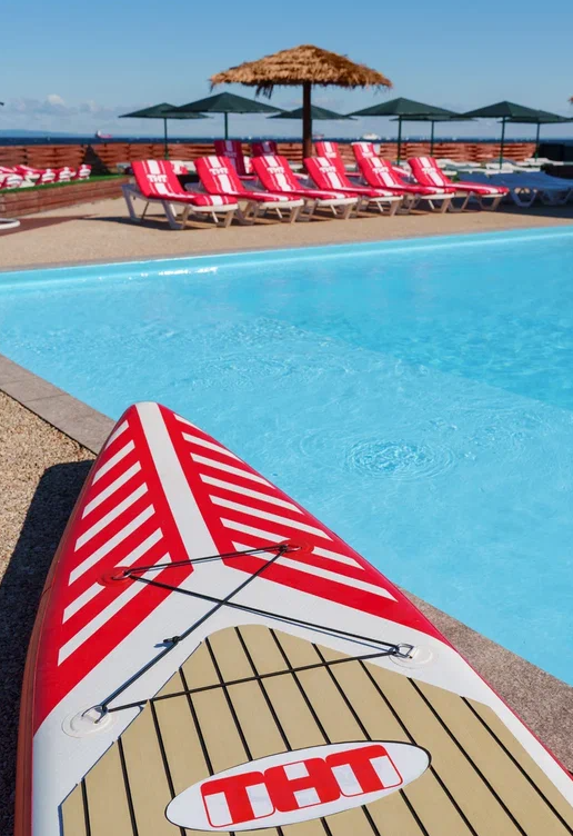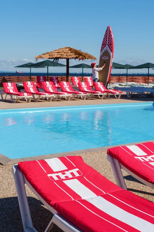 Шезлонги здесь оформлены мягкими чехлами насыщенного